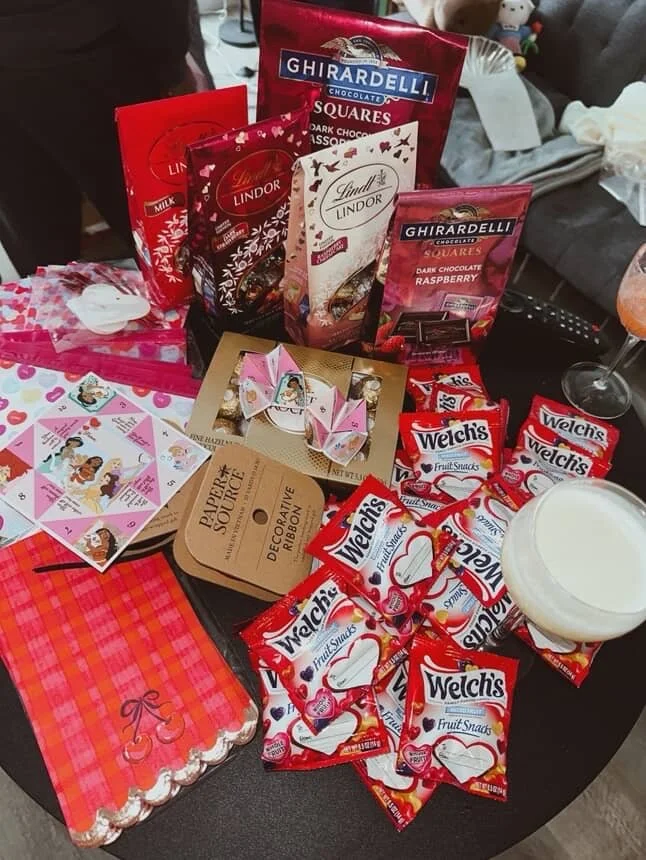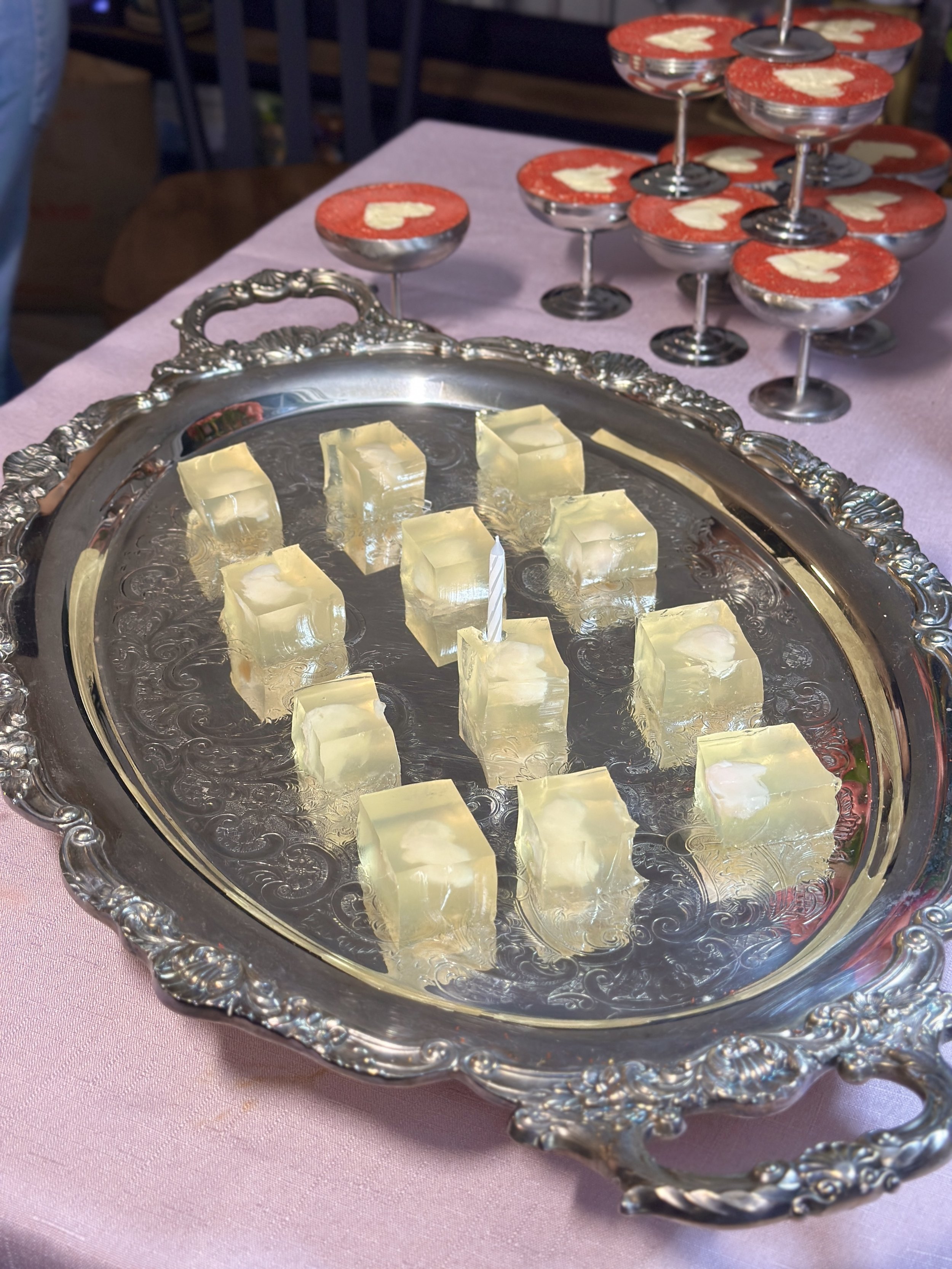 I leaned into a soft, sweet Valentine’s theme for the night which included lots of pink, lots of strawberry, and plenty of little details that made it feel extra special. I made strawberry cheesecake cookies (pink cookies), strawberry jam shortbread cookies, jello shots, strawberry tiramisu and everyone brought the cutest Valentine’s-themed snacks, treats and meals to share. The whole spread ended up looking like a dessert table from a rom-com… in the best way.
