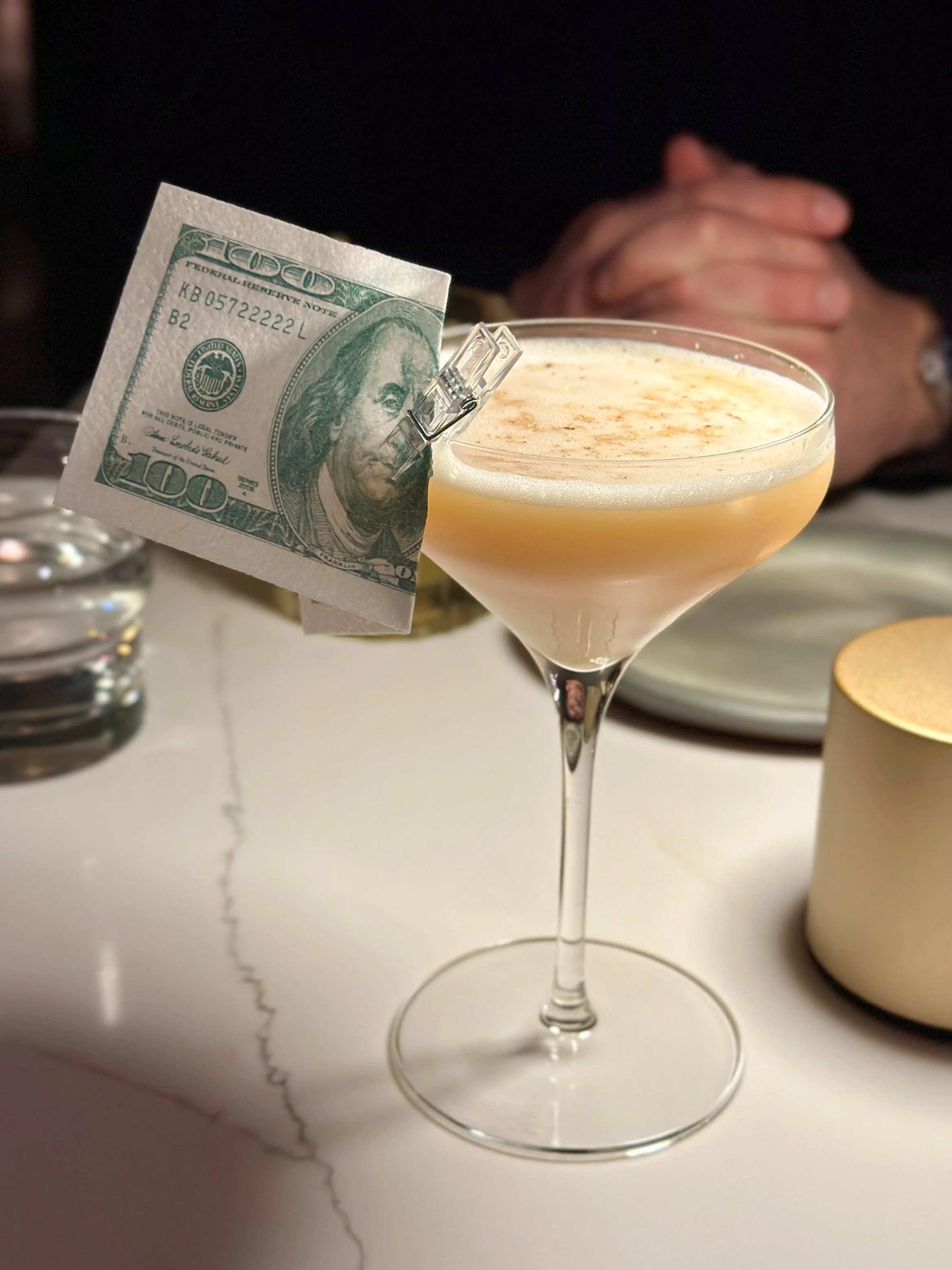 Take the Millionaire cocktail (pictured right under the title of this post)—easily my favorite. I’ll admit, the edible rice paper money clipped to the glass is what first caught my eye (I mean, how fun is that?), but the ingredients sealed the deal. With bourbon, an anise- and licorice-flavored apéritif, and more, the flavor was just as impressive as the presentation. And yes, you can actually eat the “money”!