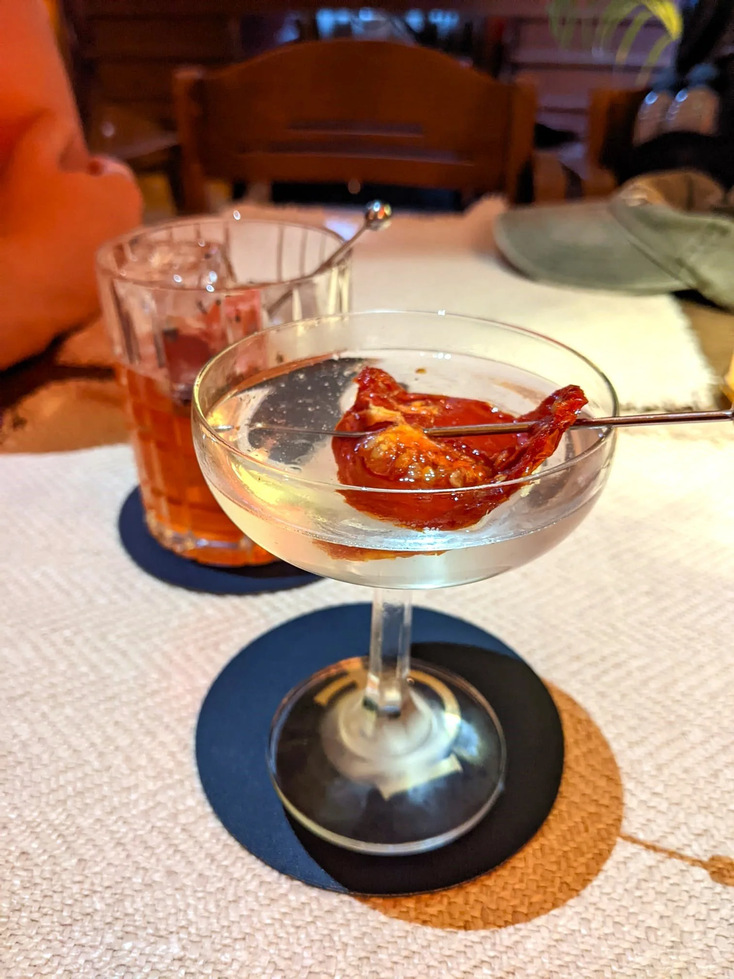 The first drink I tried at this bar was the gin tonic (Figure 1), which was my favorite cocktail in Yerevan. I wish I remembered exactly what twist they did to it because it was just better than the typical gin tonic I had. From what I do slightly remember is it was most likely a celery infused gin with a tomato as garnish.