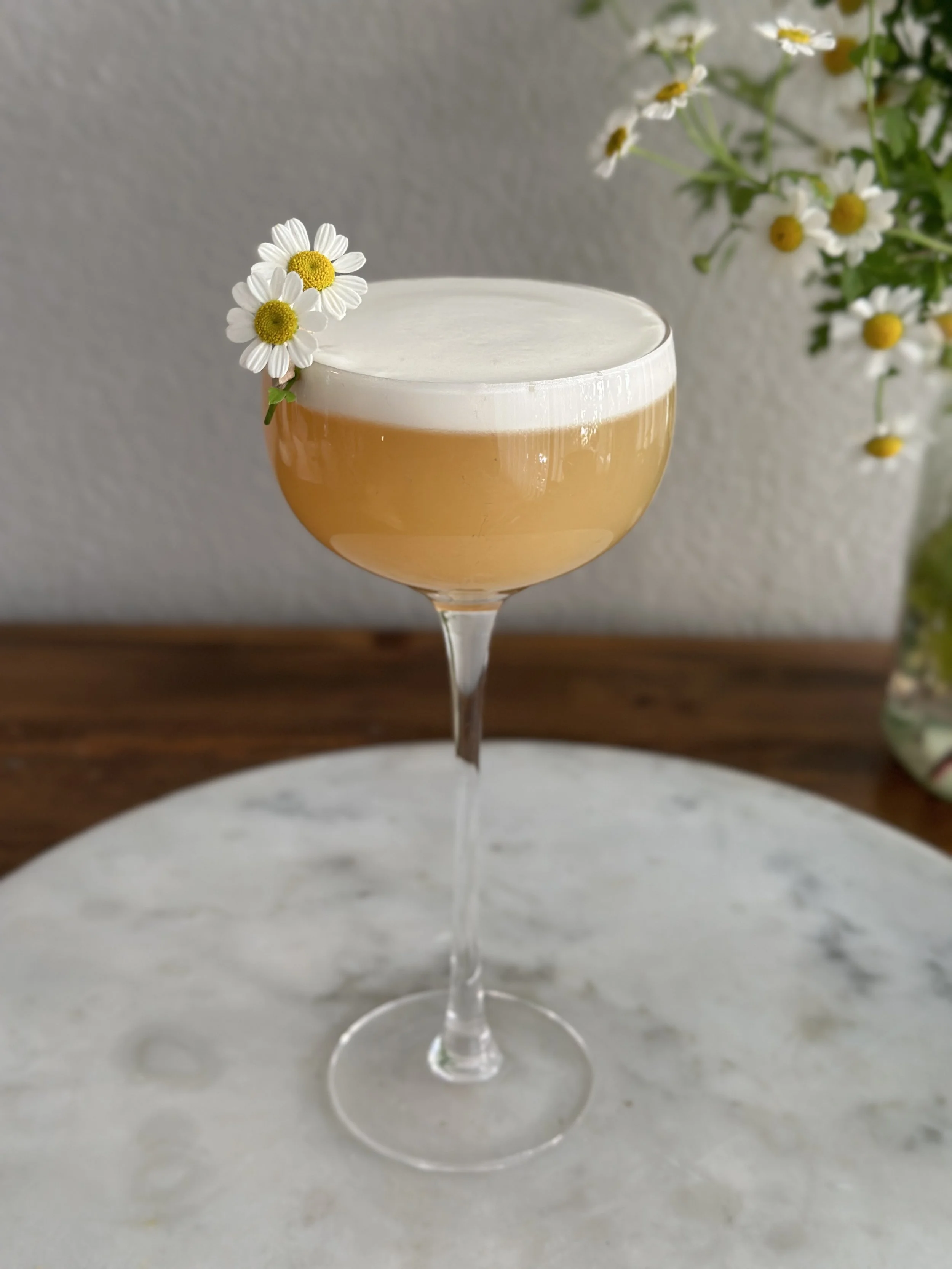 A silky blend of chamomile-infused apple brandy and vanilla vodka, brightened with a delicate egg white foam for a soft, velvety finish. Floral, subtly sweet, and warmly comforting—this cocktail captures the peaceful essence of an orchard in both blooming spring and golden autumn at dusk.