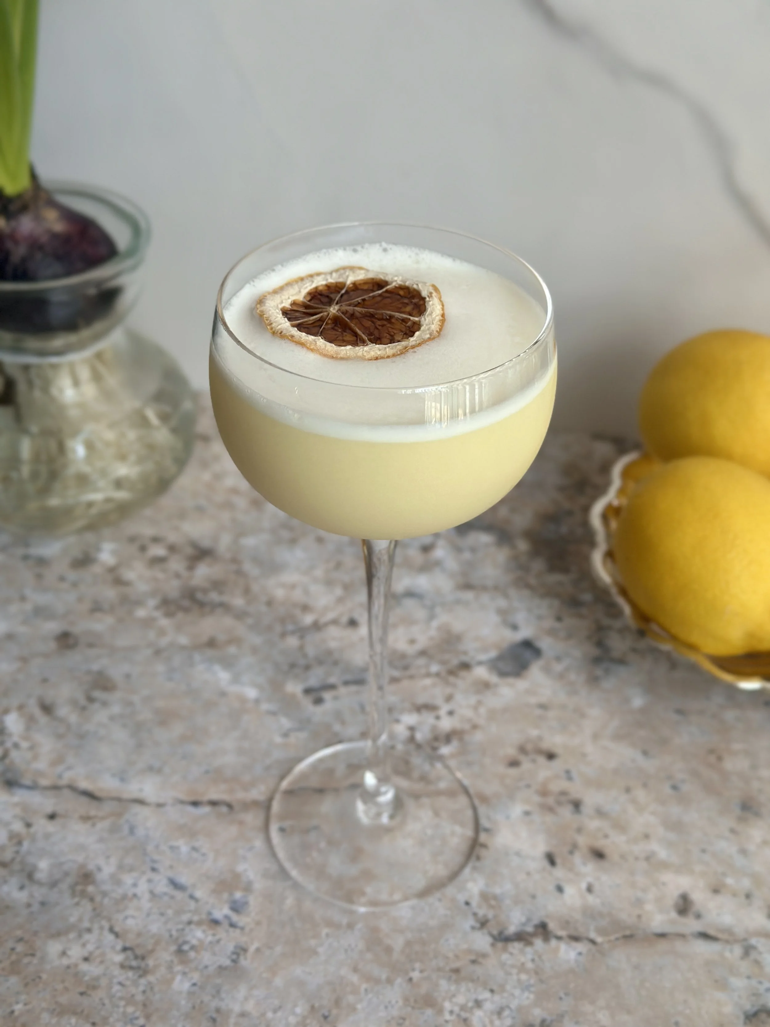 It’s reminiscent of lemon meringue pie, reimagined in a glass: luscious, citrus-forward, and softly sweet with a creamy finish. Playful yet elegant, this cocktail feels like a little citrus kiss in every sip.