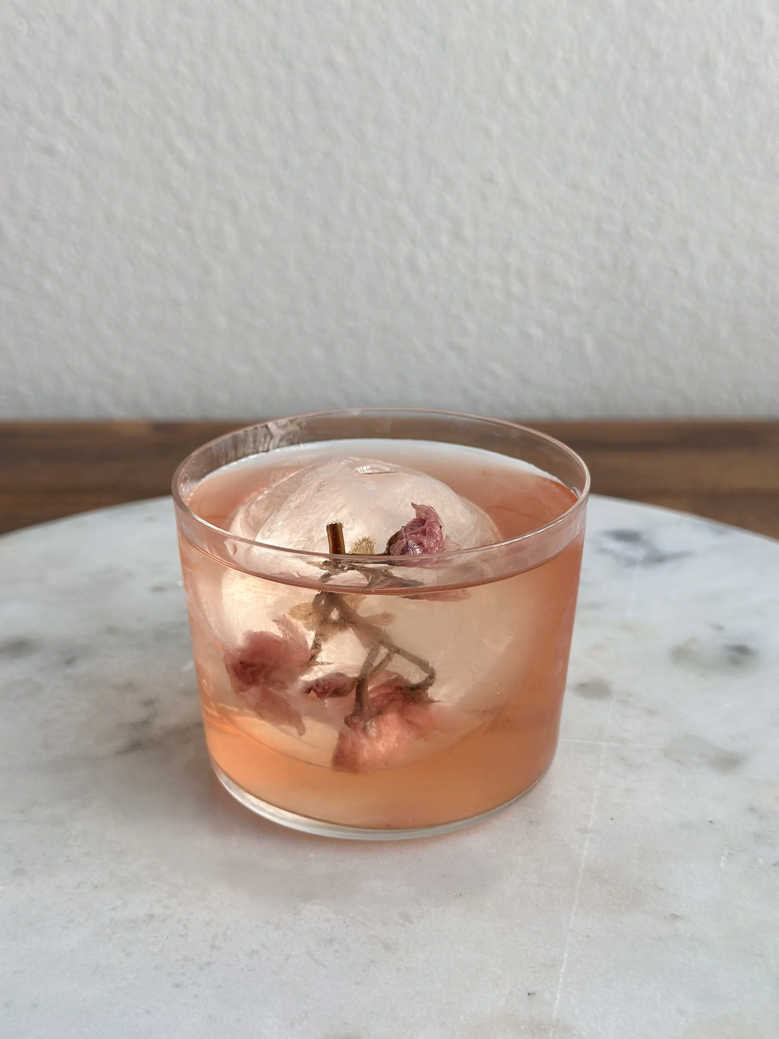 A unique and elegant blend, this cocktail combines the floral essence of sakura (cherry blossom) extract with the creamy richness of white crème de cacao and the smooth warmth of whiskey. Coconut water adds a refreshing, slightly tropical note, while a big ice cube keeps it cool and crisp. The result is a beautifully balanced drink with layers of sweetness, floral notes, and a hint of cocoa, perfect for sipping and savoring.