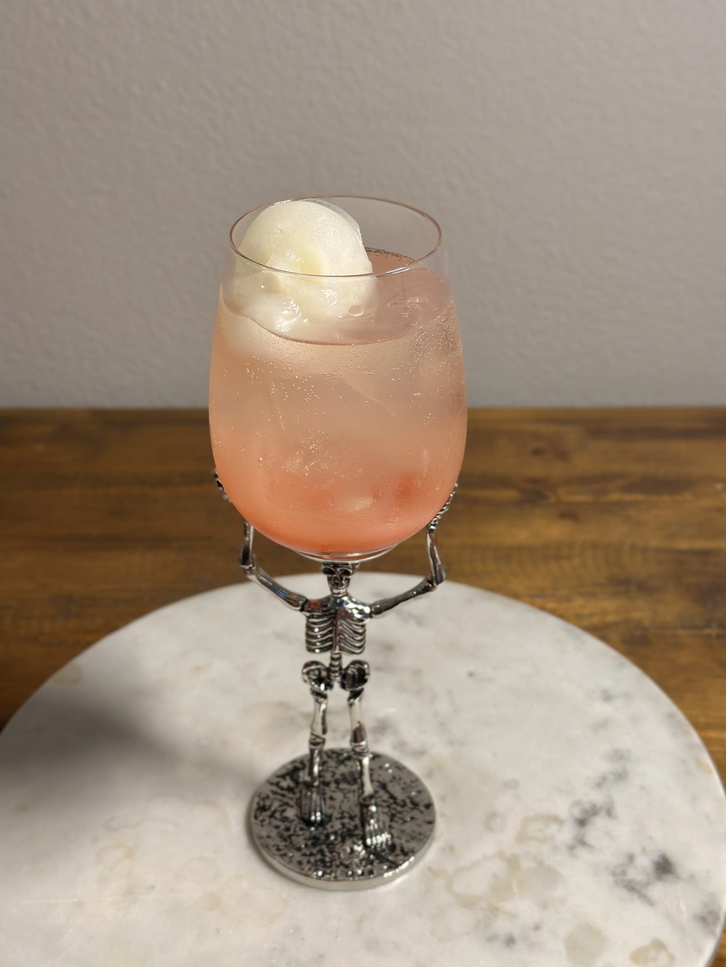 Calpico concentrate, strawberry liqueur, Prosecco, and soda water — topped with a Calpico ice cube shaped like a skeleton. Sweet, bubbly, and hauntingly refreshing.