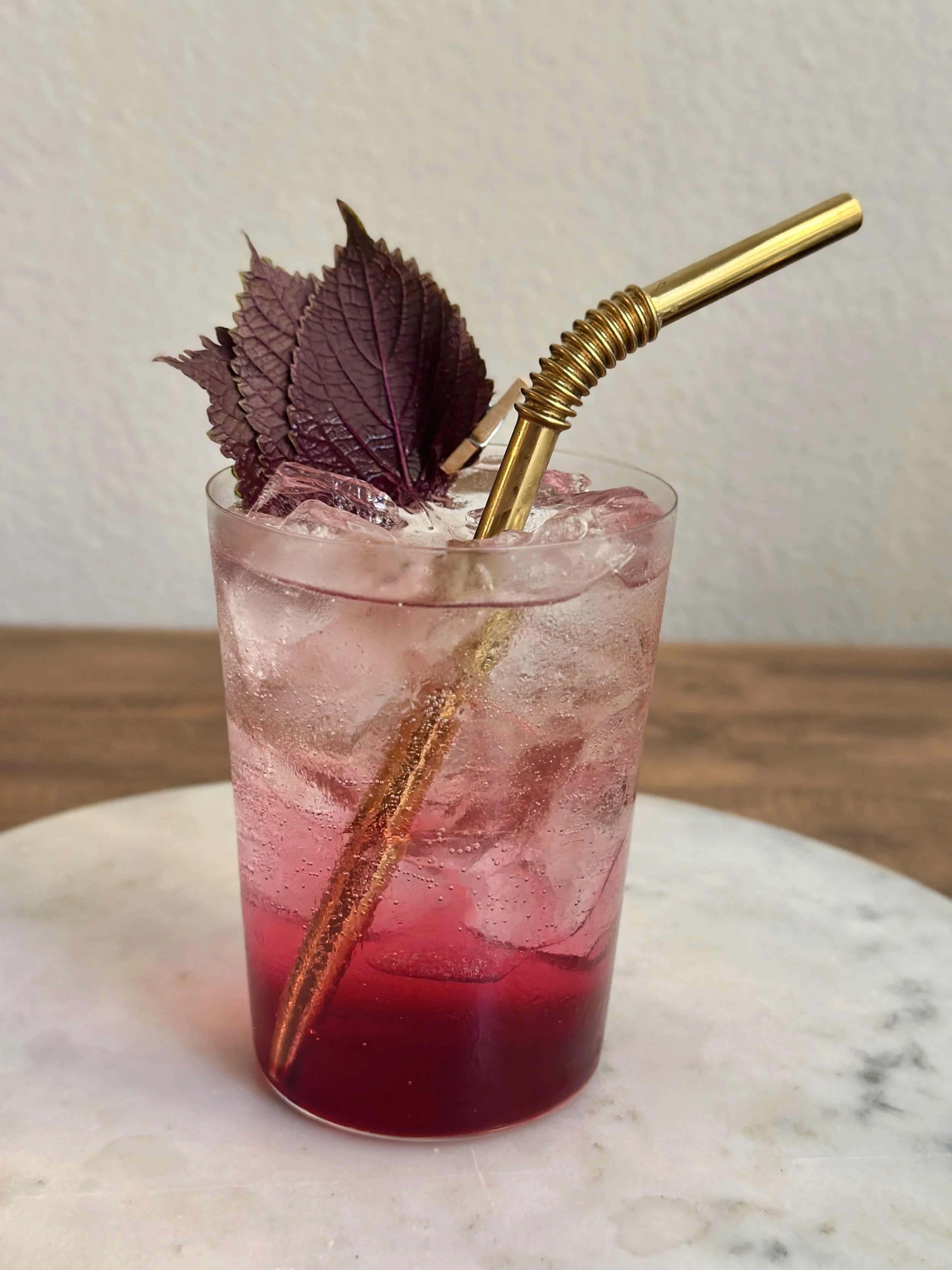 A vibrant, aromatic spritz made with red shiso concentrate, Prosecco, and a splash of soda water. Lightly herbal, subtly tart, and beautifully effervescent — a refreshing twist on the classic spritz.